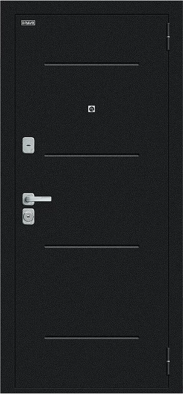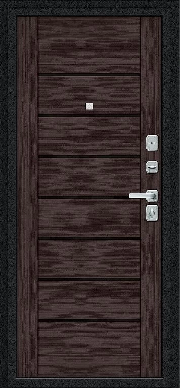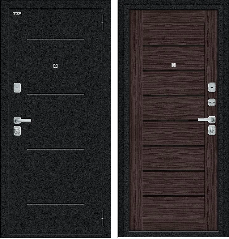 Надежная входная Дверь Браво Техно/BChrome Букле черное/Wenge Melinga премиум класса по цене 34 459 руб. Большая толщина стали защитит от проникновения в ваш дом, квартиру или коттедж. Используется очень качественная фурнитура: замки, цилиндры, ручки, защелки. Покрытие и отделка двери изготовлено под внимательным контролем производителя. Дверь имеет долгий срок службы и гарантию.